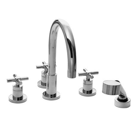 #Newport Brass Roman Tub Faucet with Handshower Only, Cross HandlesEast Linear CollectionSolid Brass ConstructionADA Compliant Cross HandlesBrass Valve BodiesQuarter-turn washer less ceramic disc 3/4" valve cartridgesQuick Connect spout designSpout c-c 7-7/8"Set Includes: 1 each Item 283 Handshower, Item 284 59" Hose, Item 289-1 Deck Flange KitMUST ORDER VALVES SEPARATELYRequires 3/4" Valve Item NB1-503, Sold Separately