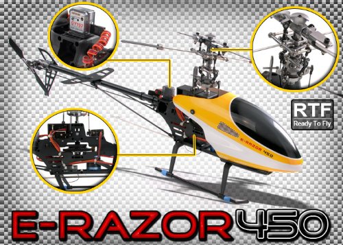 NEW!! (2.4Ghz Version) E-Razor 450 Metal RTF Direct-Belt-Drive Brushless 3D 450 Helicopter Fully-Loaded w/ Lipo, Brushless Motor+ESC and 6-Channel Remote (COLORS VARY SENT AT RANDOM) 1. Type: RTF Electric 3D Heli 2. Transmitter:6CH RTF/ARF RC Helicopter 3. Length: 25.8in (655mm) 4. Main Rotor Diameter: 28.3in (720mm) 5. Tail Rotor Dianeter: 5.3in (135mm) 6. Gross Weight: RTF with li-po battery(670g) 7. Battery: 11.1V 2200MAH 15C li-polymer 8. Motor: Brushless 2750KV 9. Control mode: 120-Degree CCPM system Features: 1.Simplify, compact and high-rigidity frame. let all electric system install easy and nice looking. 2.Use Direct-belt-drive, save power and let helicopter very quiet. 3.Use new gear inverse design:13:105, let motor more powerful and long-time. 4.By optimize design of tail gear inverse 51:11 and more long tail-blade journey, let helicopter tail more Smooth and easy lock when you flying. 5.Simple, separate servos-frame, let flyer easy install and repair. 6.In main frame, use 3pcs belling, insure to the main shaft concentric and less shake. 7.High-precision tail double-push frame, more smooth and wearable. 8.The separate main gear let flyer install and repair more easy and fast.