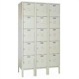 | ✚✚✚ Lyon DD53023 5 Tier Steel Locker Unit with 3 Frames, 36" Width x 12" Depth x 60" Height, Dove Gray One piece, top to bottom 16 guage steel door strike on all steel lockers for strength and security. Powdered-metal nano roller latching system provides up to three times the break-in protection compared to existing locker latching systems. Quieting nylon glides positioned at lock bar pins hush door operations. All one-piece locker door construction from prime, highgrade class 16 guage steel for extra strength and durability. Recessed handles with finger lift offer added safety and security, clean flush mount appearance. 5 Tier lockers provide high density storage for individual belongings and supplies. Great in classrooms, laboratories, gymnasiums, sports and recreational facilities, and more. 6" legs rear legs are adjustable for leveling; 3" to 6" louvers for ventilation.