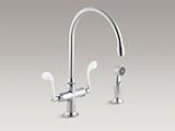 KOHLER K-8763-G Essex Kitchen Sink Faucet, Brushed ChromeFinish/Color:Brushed Chrome, Faucet Centers*:Requires Two Holes Wristblade Handles Includes Matching Finish Side spray One-piece Ceramic Valve - Resists debris and hard water build-up Ergonomic Handle Rotation - Provides on/off water control with only a quarter turn Two Hole Installation Solid Brass Construction -- Ensures years of reliable performance Lifetime Limited Warranty-Covers function and finish for as long as the original consumer purchaser owns his/her home Resists scratches, corrosion, and tarnishing Complies with the actuation force accessibility Guidelines (Section 4.27.4 Operation) of the Americans with Disabilities Act 9-1/4' gooseneck swing spout, wristblade handles 2.5 gpm